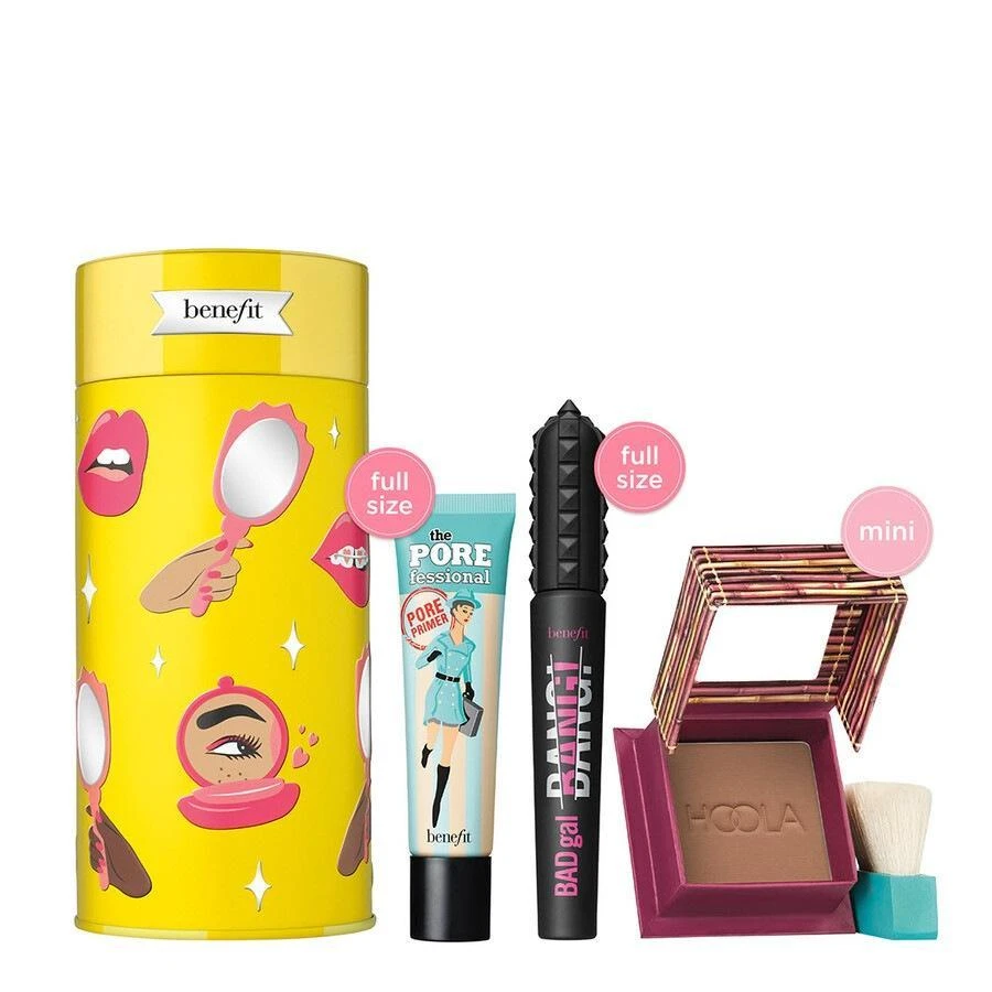 Creëer volumineuze wimpers met de best selling BADgal BANG! mascara, minimaliseer de zichtbaarheid van uw poriën en fijne lijntjes met de matterende gezichtsprimer POREfessional en en creëer de ultieme natuurlijk gebronsde teint met de Hoola bronzer. Wordt verpakt in een herbruikbaar blik dat klaar is om cadeau te doen!