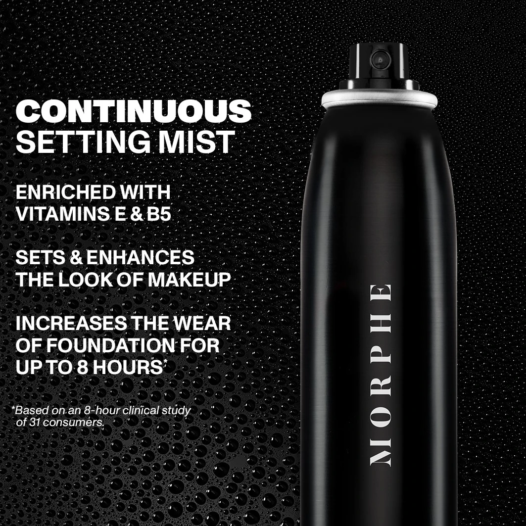 Zorg dat er niets tegen uw kunsten op kan, Morphe-babe. Hallo, nieuwe favoriete Continuous Setting Mist Fixeerspray van Morphe en vaarwel smeltende, opgehoopte en vervagende make-up. Een luchtaangedreven spray zorgt voor gelijkmatige, beheerste applicatie. De superfijne spray fixeert vloeibare- en poedermake-up en zorgt voor een stralende finish. Hier is uw nieuwe obsessie!