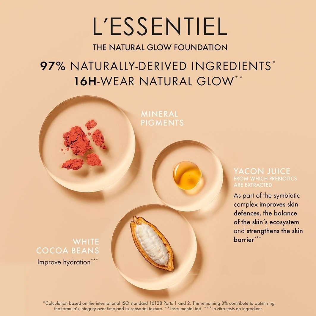 Een foundation met 97% natuurlijke ingrediënten, met een natuurlijke en stralende finish, die 16 uur houdt. De teint is perfect, helder en fris. De textuur is comfortabel en ideaal om een lichte tot medium dekking mee te creëren. Met L’Essentiel wordt de huid iedere dag mooier. De formule laat de huid ademen, hydrateert, brengt in balans en beschermt de huid tegen verontreiniging. De teint is egaler en oneffenheden zijn minder zichtbaar. De unieke en bijzondere flacon is ontworpen door Mathieu Lehanneur en is geïnspireerd door de simpele kunst van balans. L’Essentiel bevat extracten van taragom en rode alg, die de huid laten ademen. Ook bevat het extracten van witte cacaobonen, probiotica en prebiotica, die de schoonheid van de huid beschermen, het evenwicht bewaren en hydrateren.