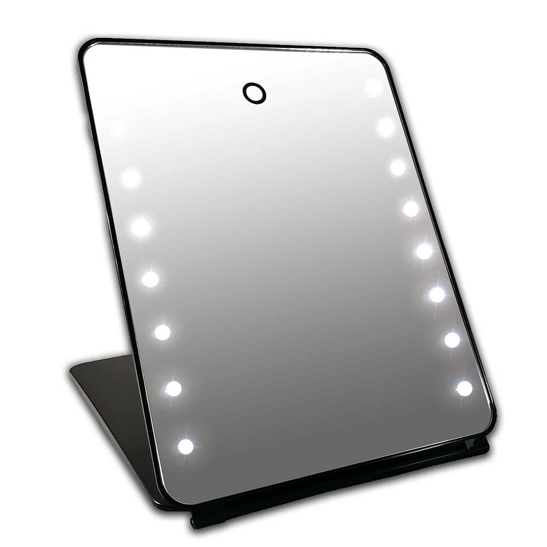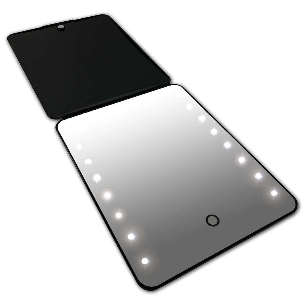 De I-pad spiegel heeft een normale vergroting en beschikt over 16 LED lampjes. De spiegel kan worden dichtgeklapt, waardoor deze veilig kan worden opgeborgen. In de klep van de spiegel zit een magneet waardoor deze niet zomaar zal opengaan. De spiegel beschikt over een accu en wordt geleverd met een micro USB laadkabel.