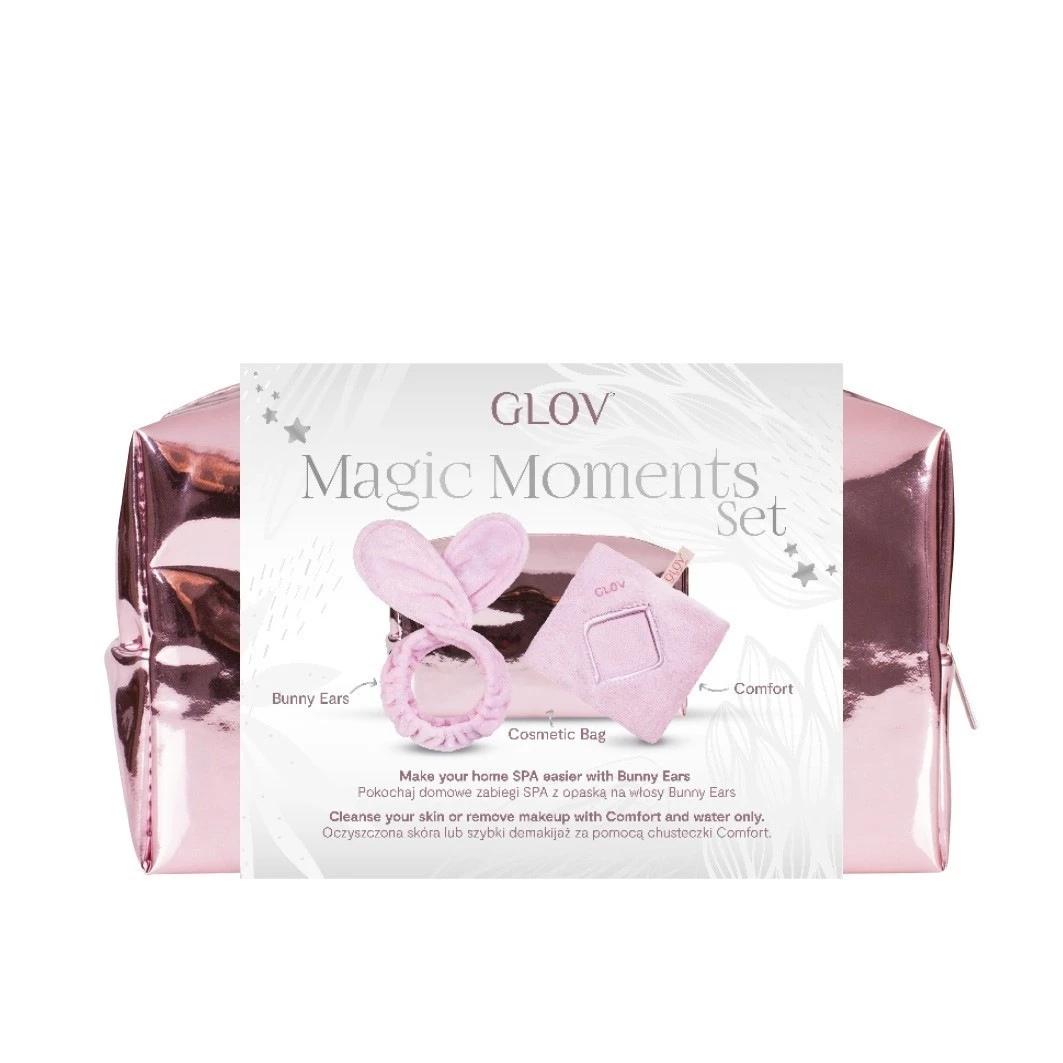 De GLOV® Magic Moments Set is een 3-delige huidverzorgingsset met daarin de GLOV® Comfort make-up verwijderende en gezichtsreinigende handdoek, de Bunny Ears hoofdband en een metalen cosmeticatasje waarin u gemakkelijk uw meest essentiële huidverzorgingsproducten kunt bewaren.