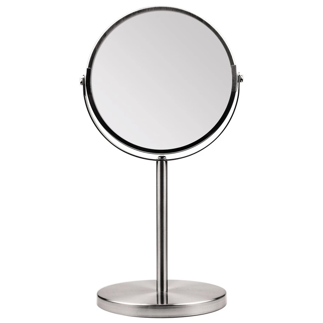 Ronde staande spiegel geborsteld metaal 2 zijdig normaal en 2x vergrotend doorsnede spiegel 18cm hoogte 34cm (wordt in 3 delen geleverd).