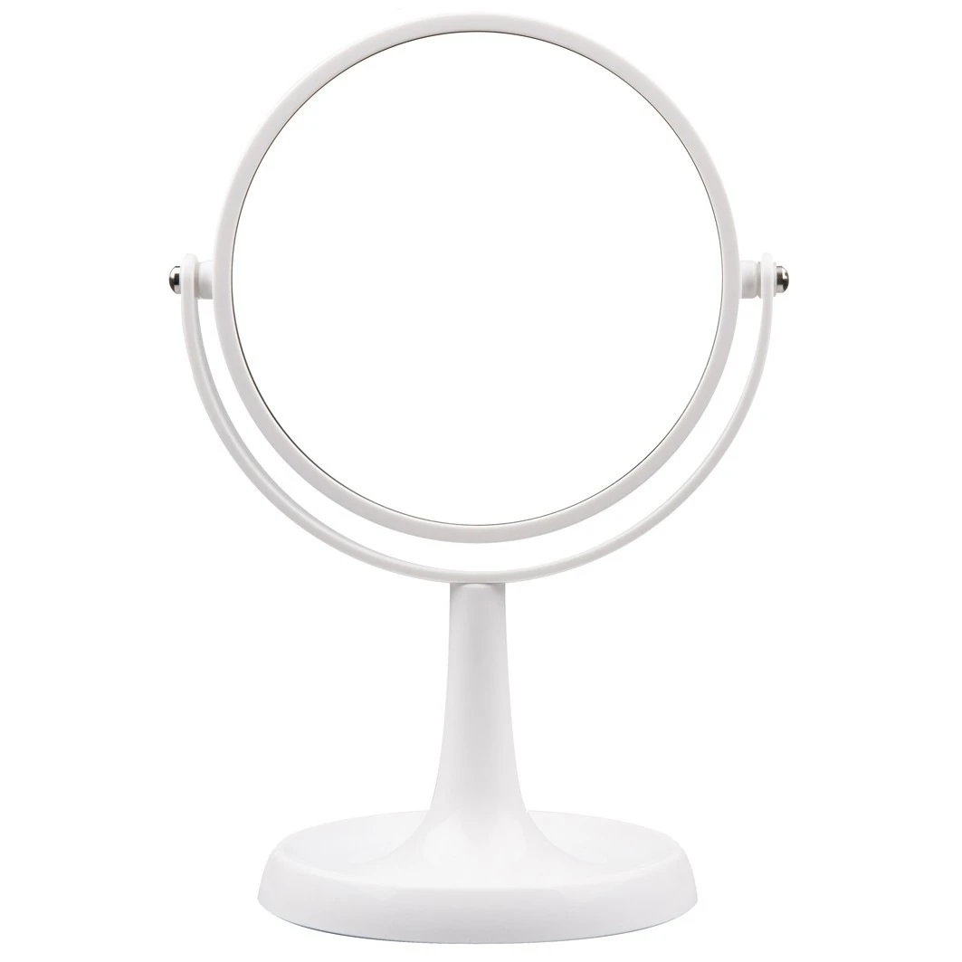 Ronde spiegel op voet 2 zijdig, normaal en 5x vergrotend doorsnede spiegel 15cm hoogte 28cm kleur: wit.